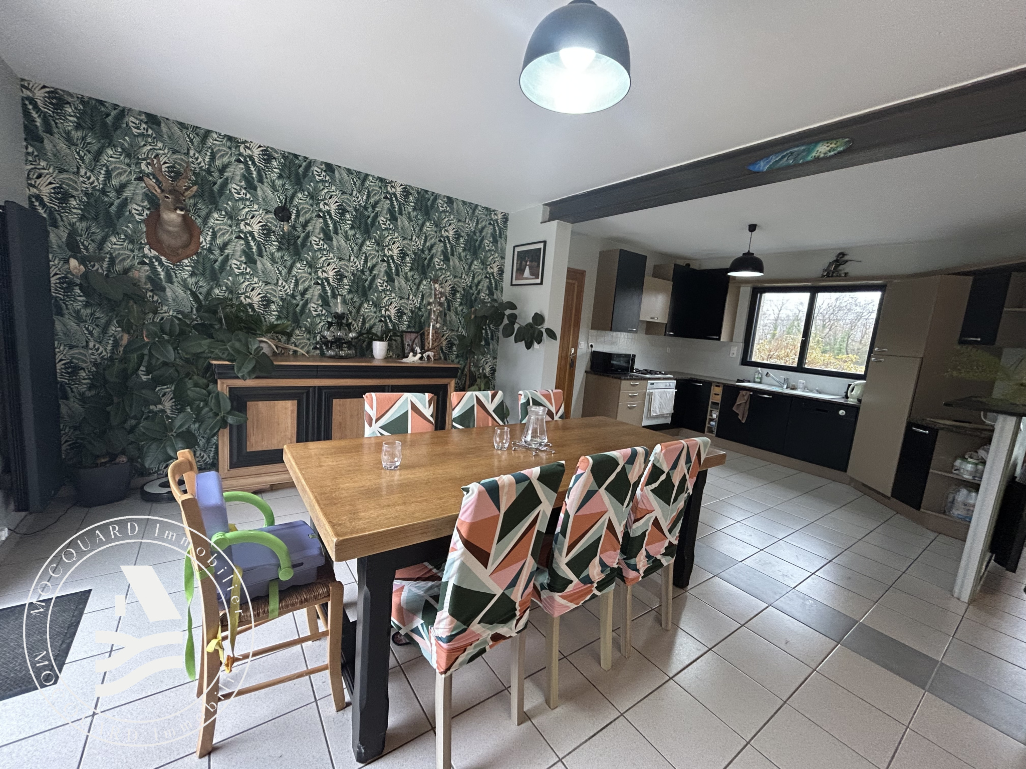 La maison s’ouvre sur une jolie entrée menant à une pièce de vie d’environ 45m² avec cuisine ouverte, baignée de lumière grâce à son exposition ouest.