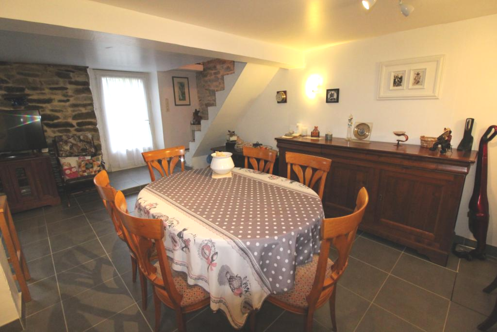 Cette charmante habitation rénovée située au coeur de bourg, à une centaine de mètres du port offre un séjour/salon avec une cuisine ouverte, deux chambres, une salle de bains et une salle de douches et un bureau.