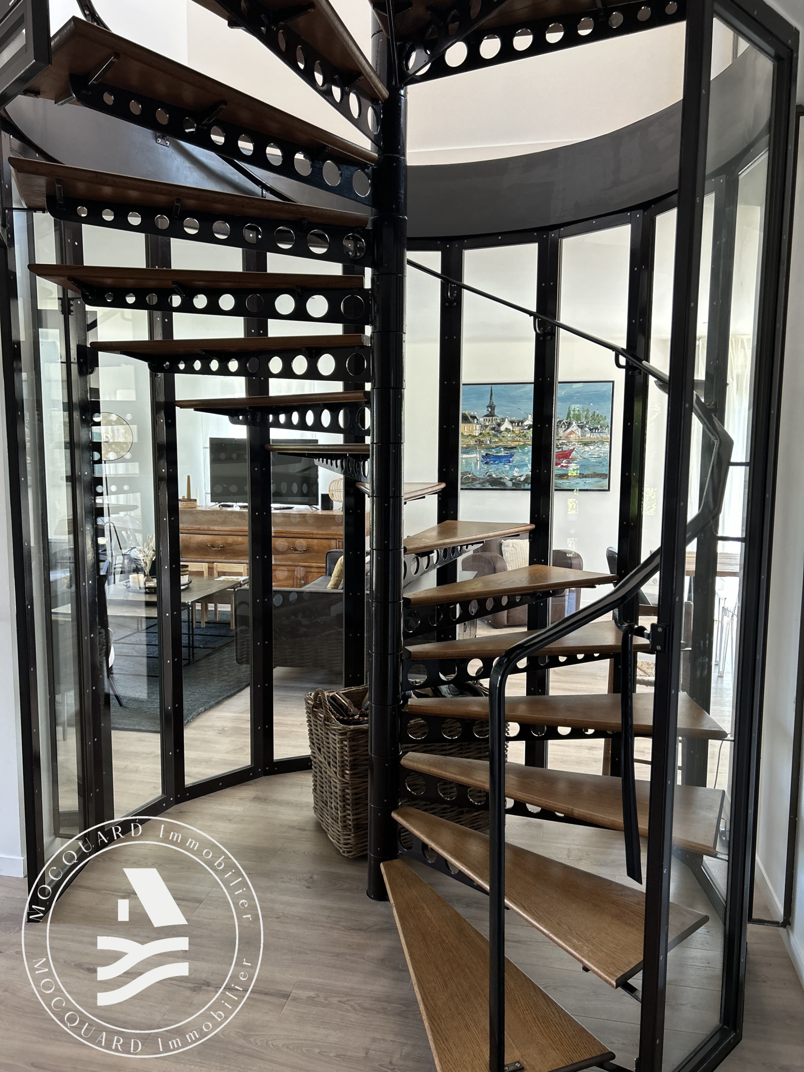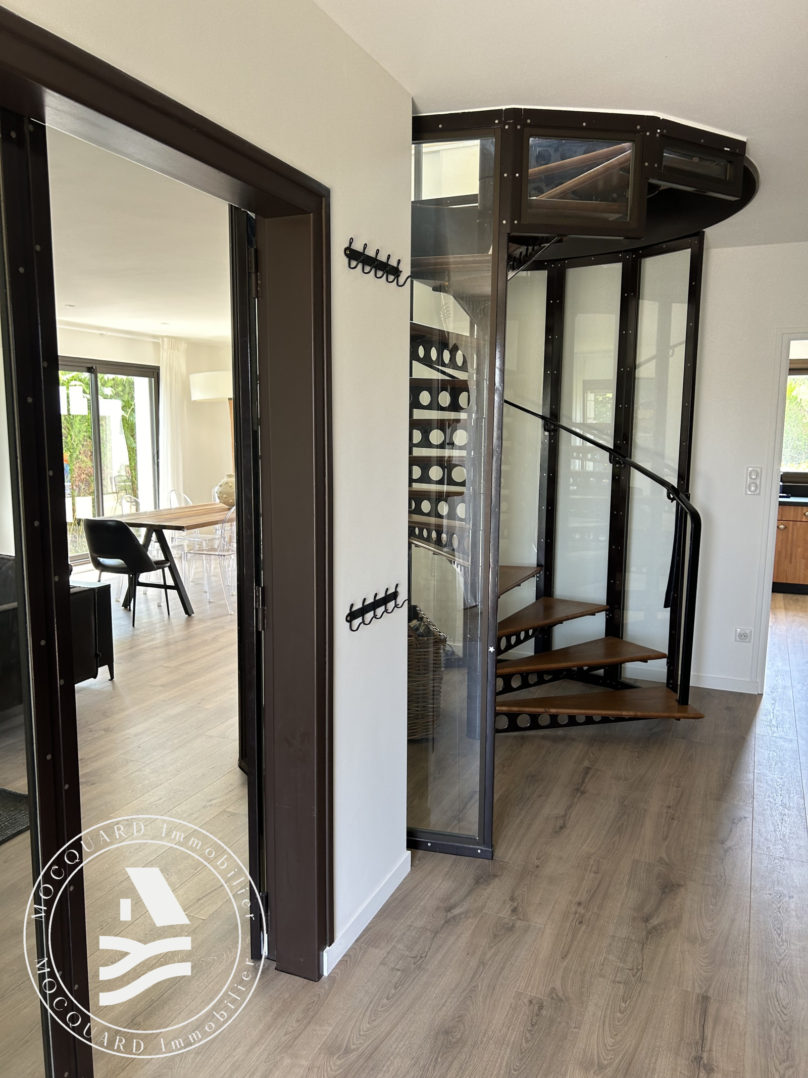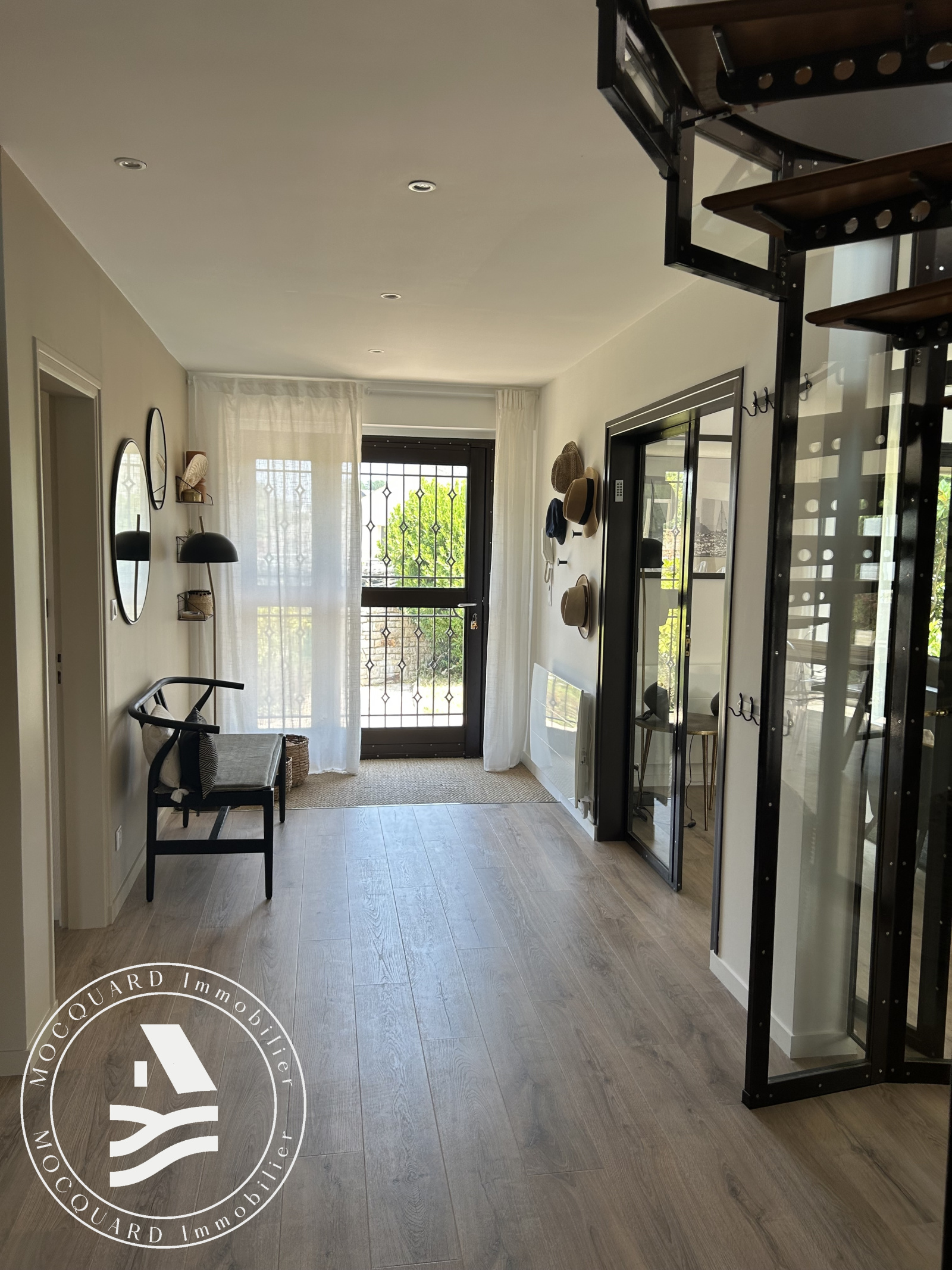 D'une superficie d’environ 198 m², elle s’ouvre sur une belle entrée mettant en valeur un escalier atypique, véritable pièce maîtresse de la maison.