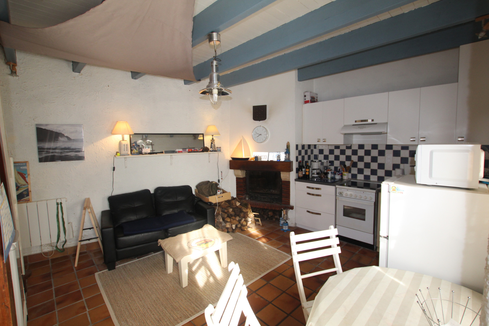 Au rez-de-chaussée : une pièce de vie avec une cuisine ouverte.