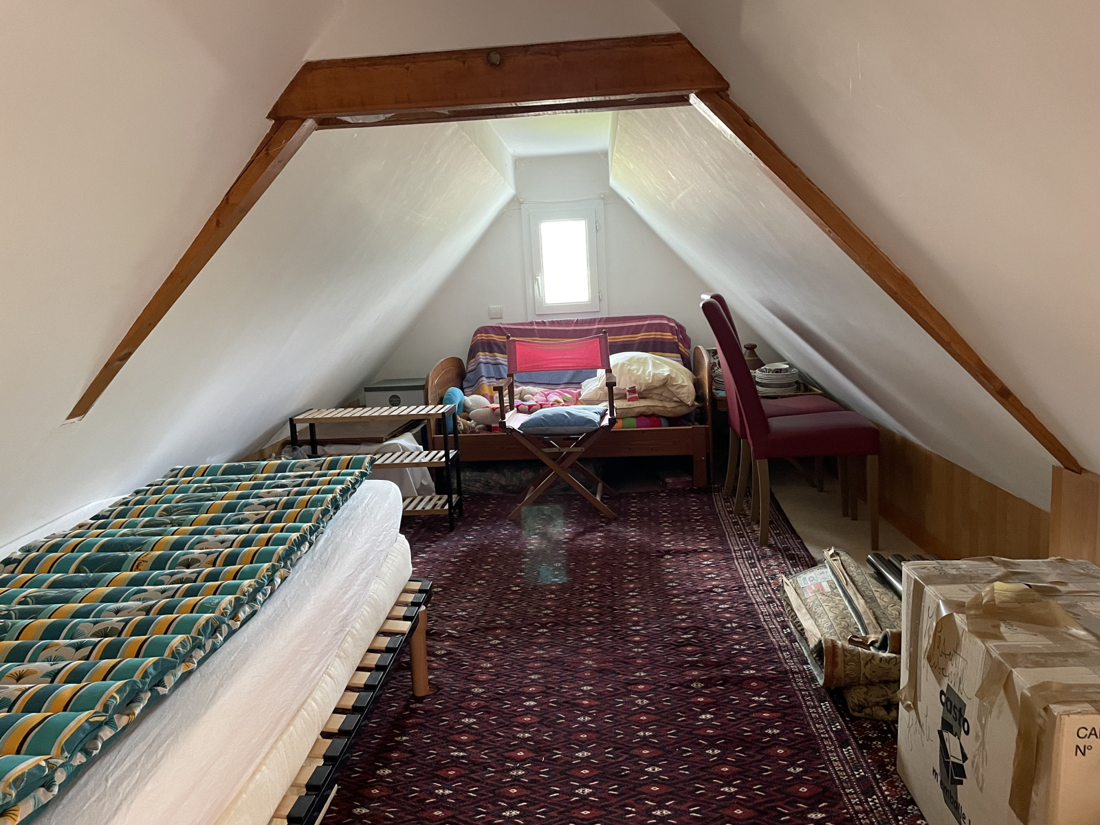 À l'étage, vous trouverez une seconde chambre avec salle de douches, WC et un coin nuit supplémentaire.