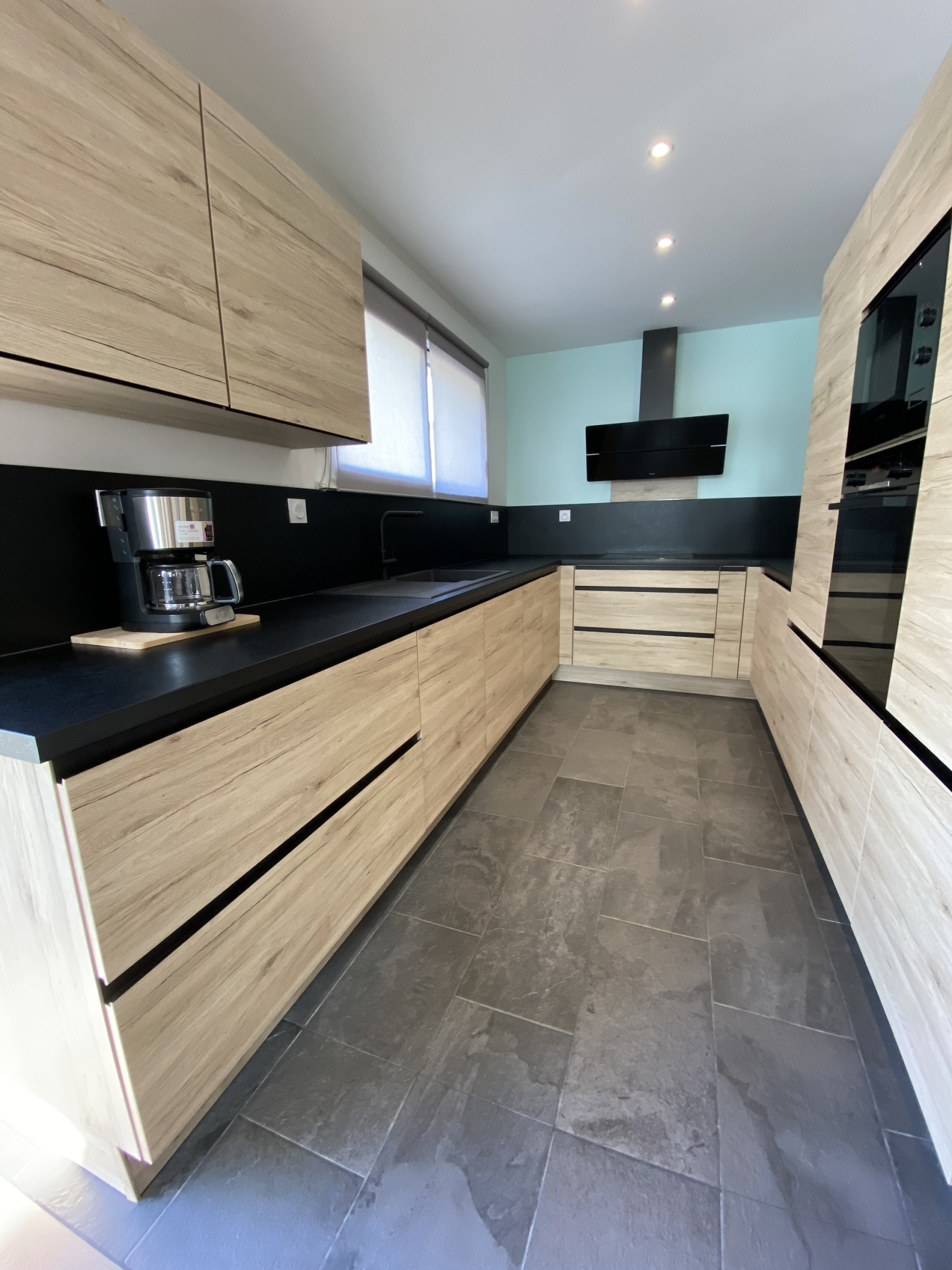 Elle se compose d'une entrée, d'une cuisine équipée/aménagée ouverte sur un séjour/salon donnant sur la terrasse ( en bois exotique), une chambre parentale avec salle de douches, wc, buanderie et garage carrelé.