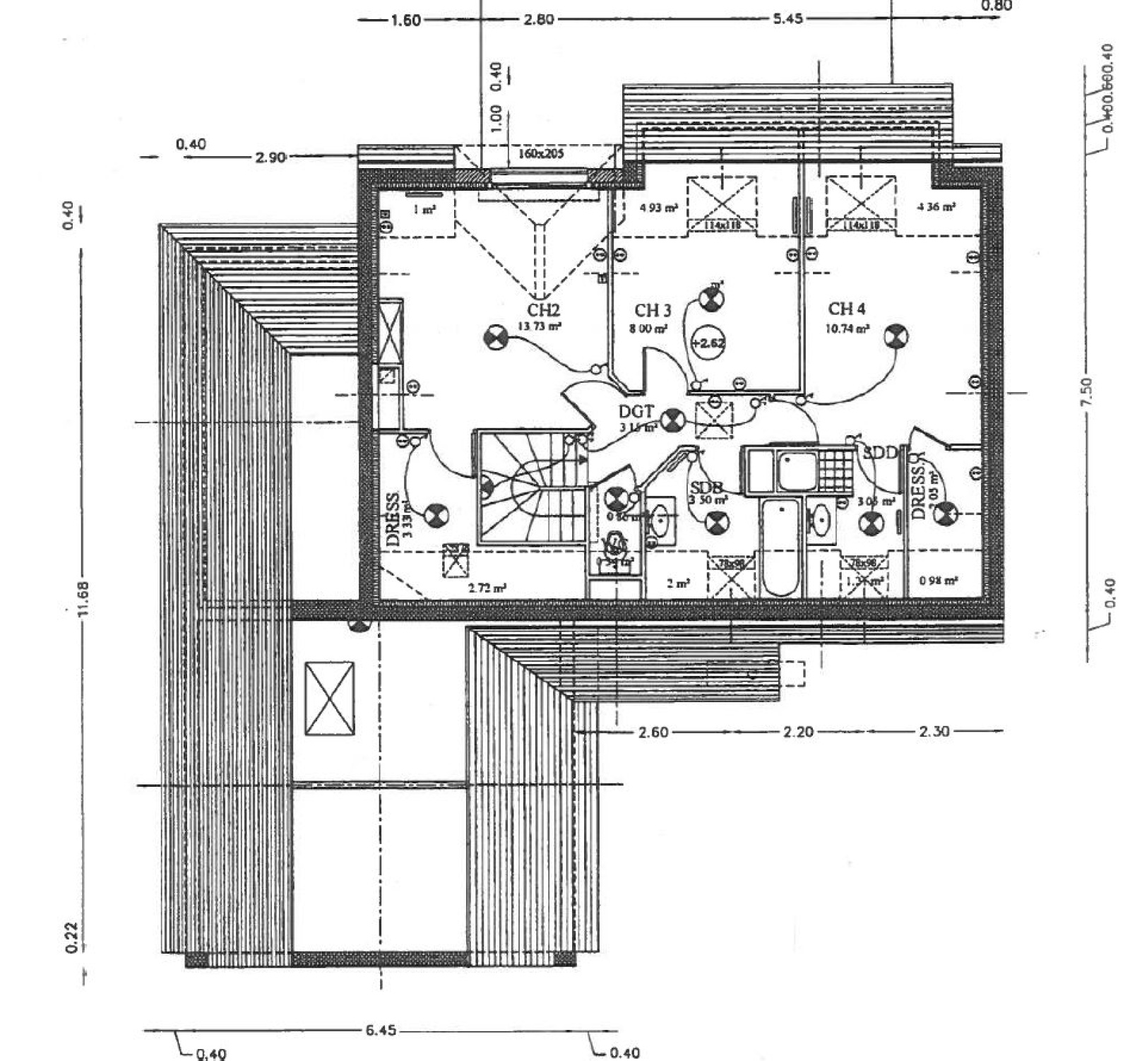 A l'étage : 3 chambres, dont 2 avec dressing. Une chambre avec sa salle d'eau attenante. Salle de bains, wc.