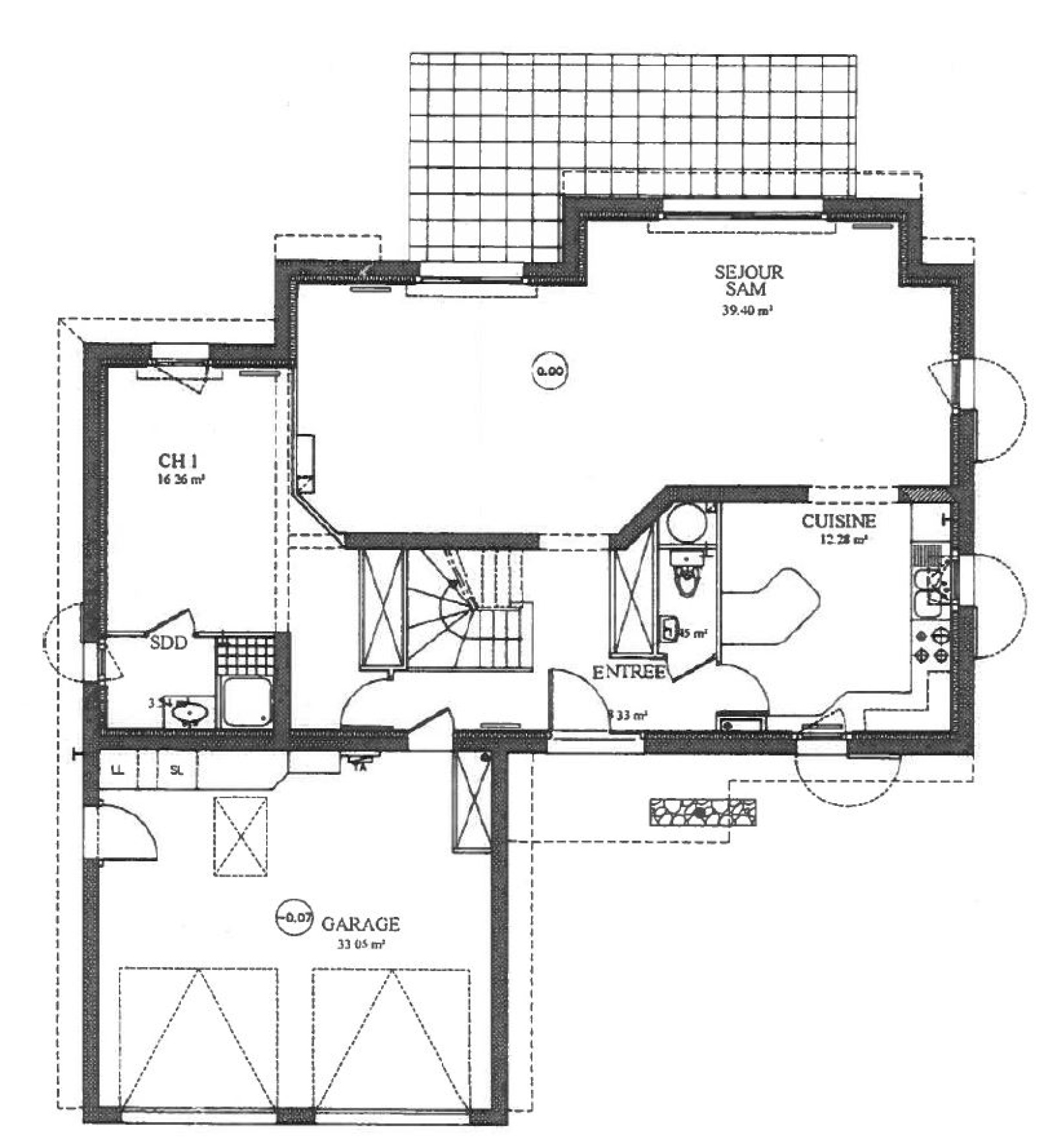 Elle se compose au rez-de-chaussée d'une entrée, d'un agréable séjour/salon de 39 m², d'une cuisine, wc, suite parentale avec salle d'eau, double garage.