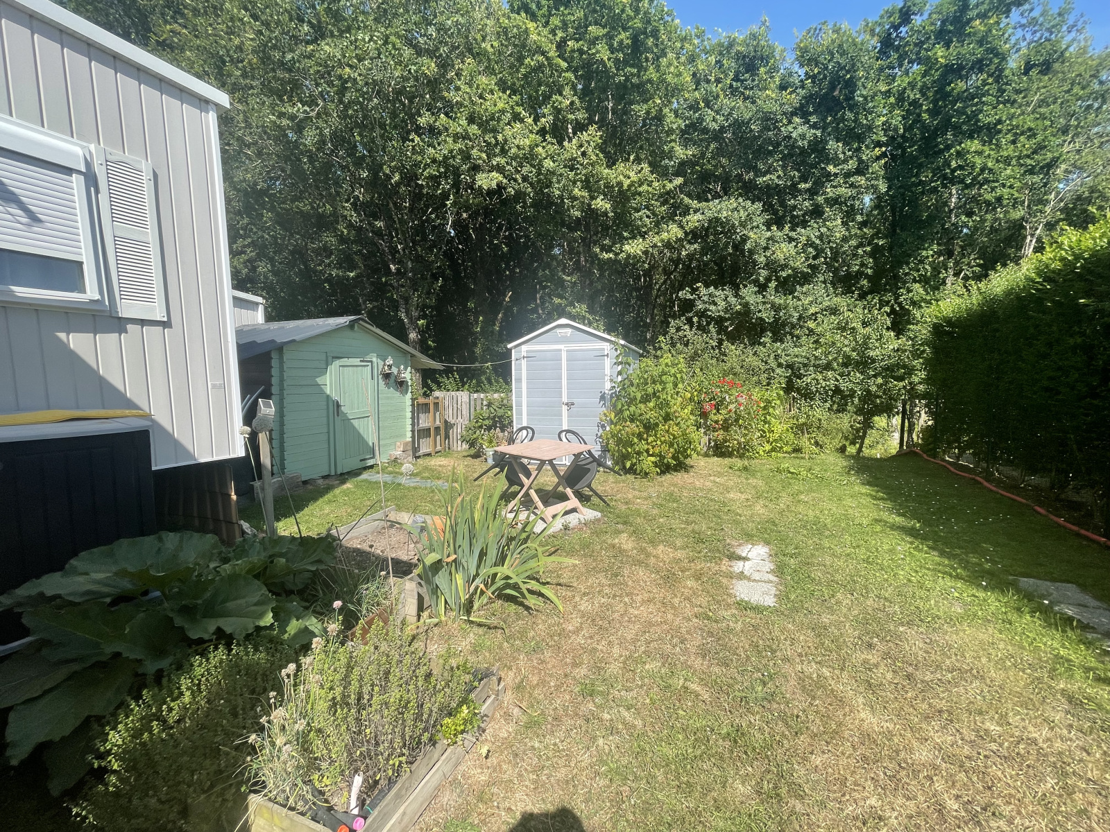 À l’extérieur, vous profiterez d’une terrasse de 17 m², de deux chalets de rangement et d’un joli jardin arboré, propice à la détente.