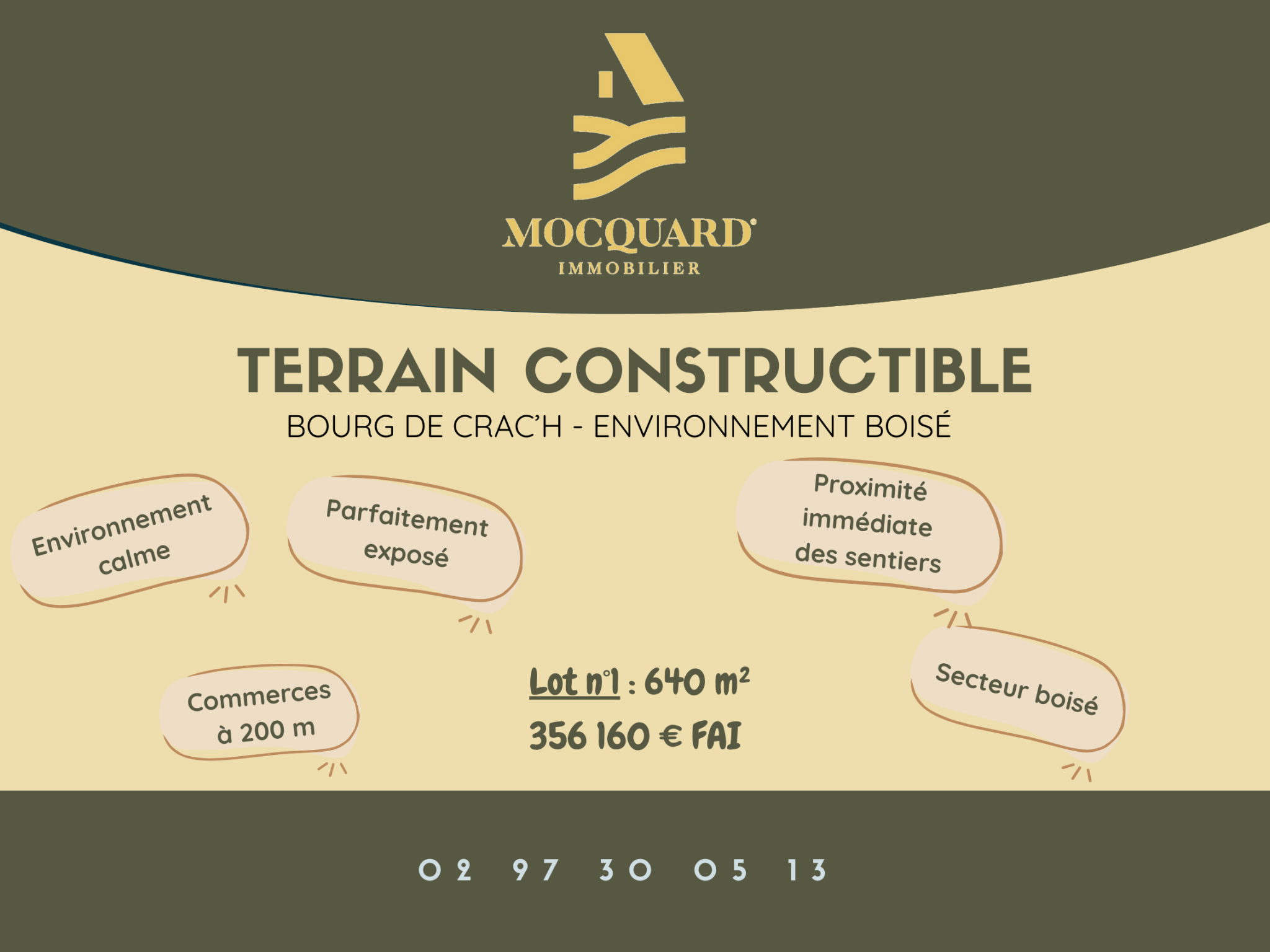 Crach (56950)Situé sur la commune recherchée de Crach, ce terrain à bâtir de 640 m² offre un cadre de vie idéal, alliant confort, nature et praticité. À proximité immédiate des commerces et des écoles, il permet un quotidien facile et agréable pour toute la famille.