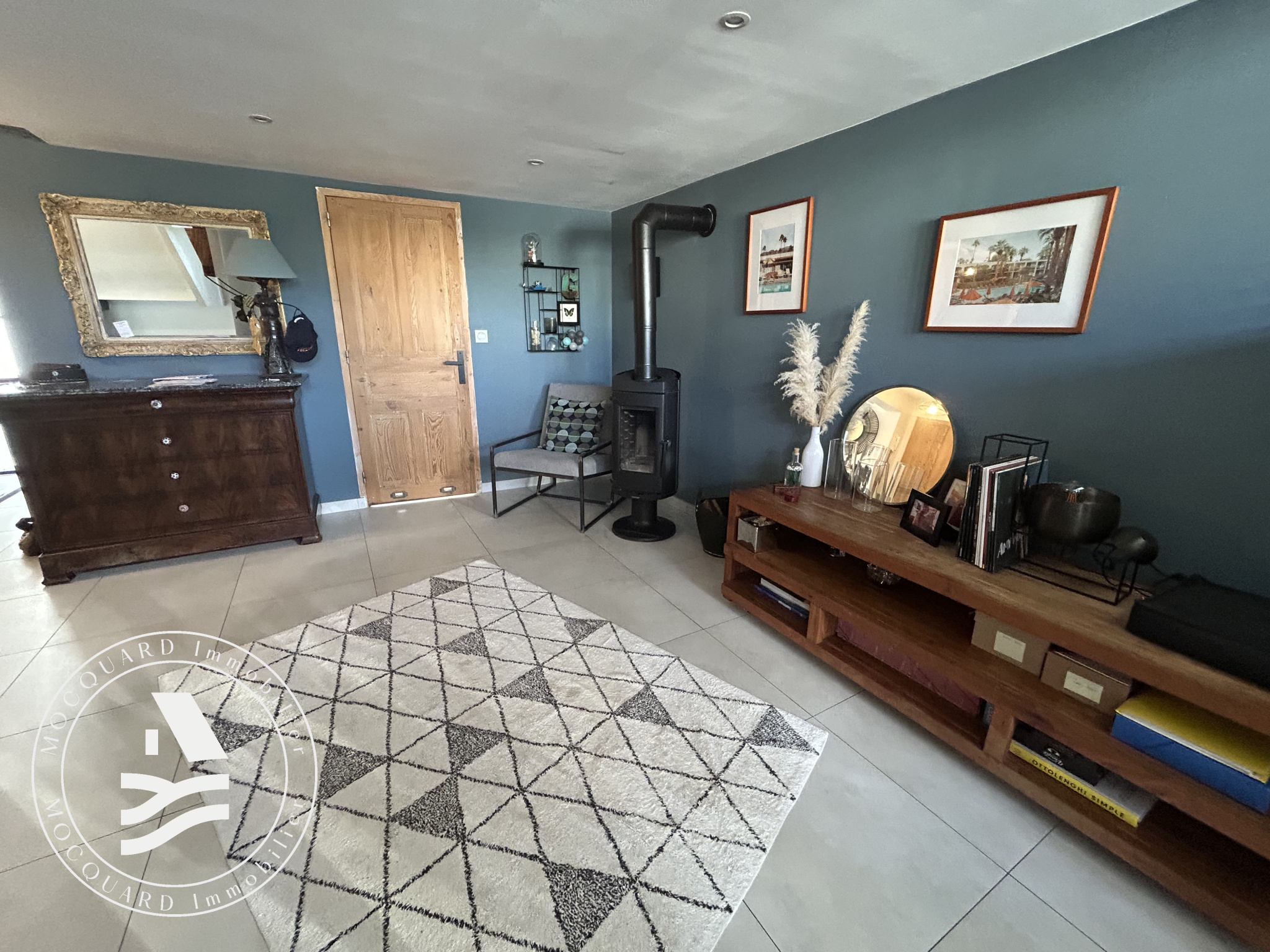 Derrière ses murs de pierre se dévoile une maison lumineuse d’environ 155 m² habitables (180 m² utiles), pensée pour le confort et la convivialité. L’espace de vie, baigné de lumière grâce à ses larges baies vitrées, s’ouvre sur une terrasse en bois et un jardin clos, créant une douce continuité entre intérieur et extérieur. Le séjour, chaleureux et spacieux, s’articule autour d’un poêle à bois, invitant aux moments de détente. La cuisine contemporaine, élégante et fonctionnelle, s’intègre harmonieusement à l’ensemble.