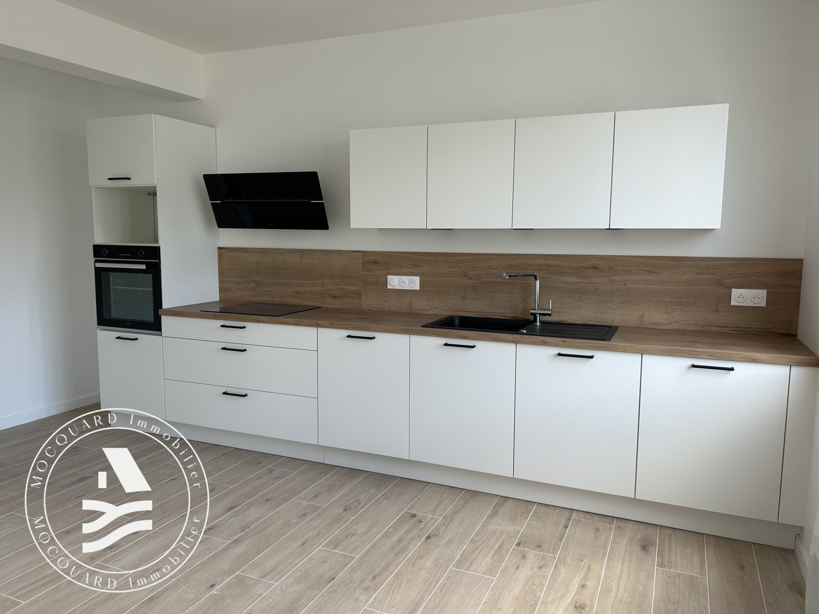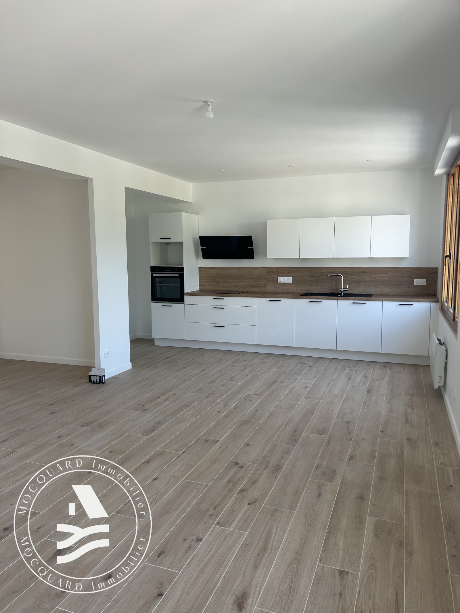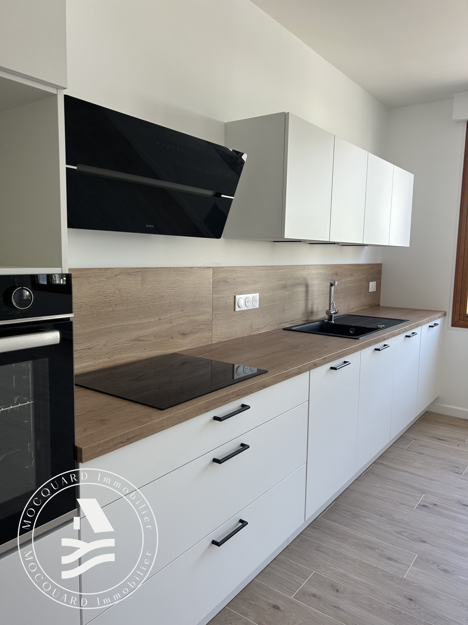 Au premier étage d'une petite copropriété, dès l’entrée, une belle et spacieuse pièce de vie baignée de lumière, offrant un espace convivial et chaleureux, la cuisine ouverte.