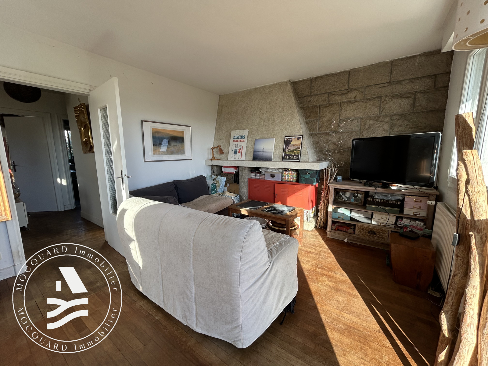 Au premier étage, la pièce de vie se réchauffe autour de la cheminée et s’accompagne d’une chambre, d’une salle de bains, d’un WC et d’une cuisine, formant un espace convivial où l’on se projette instantanément.