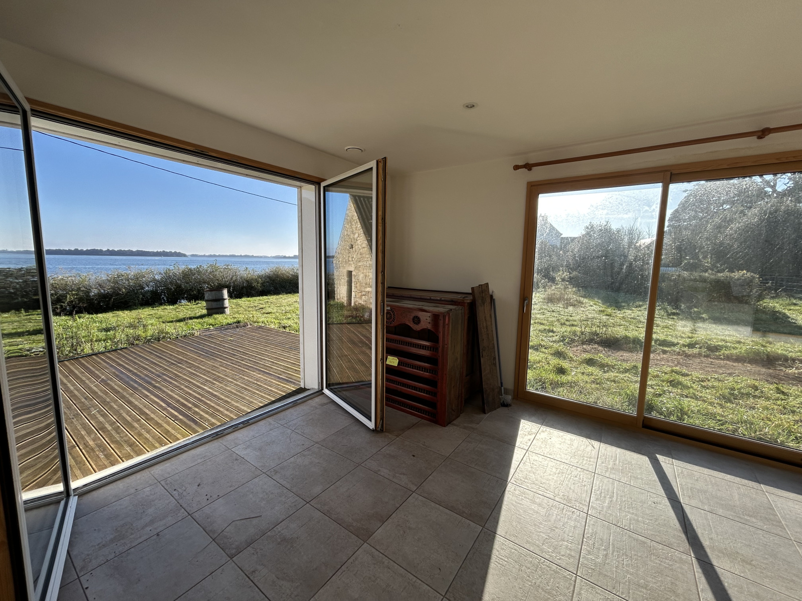 Le panorama, visible depuis la pièce de vie et depuis les chambres de l’étage, offre un spectacle permanent au rythme des marées et confère à l’ensemble une atmosphère unique.