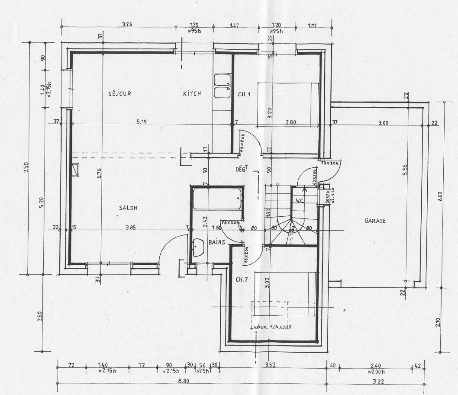 A l'étage: 2 chambres/ bureaux, espace cuisine, salle de douches, wc, grenier.