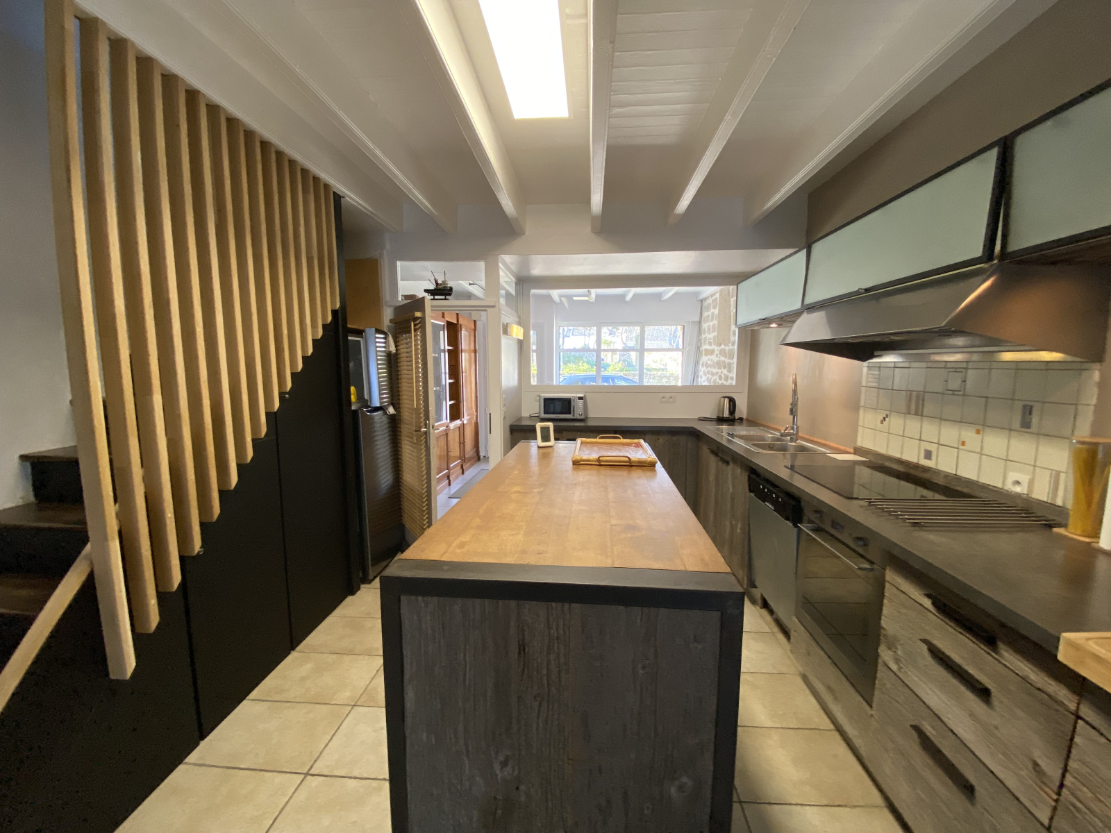 Elle se compose d'une entrée spacieuse, cuisine ouverte sur séjour-salon donnant sur un jardin " de curé" clos de mur en pierres, salon coocooning avec sa cheminée, salle de bains, buanderie.